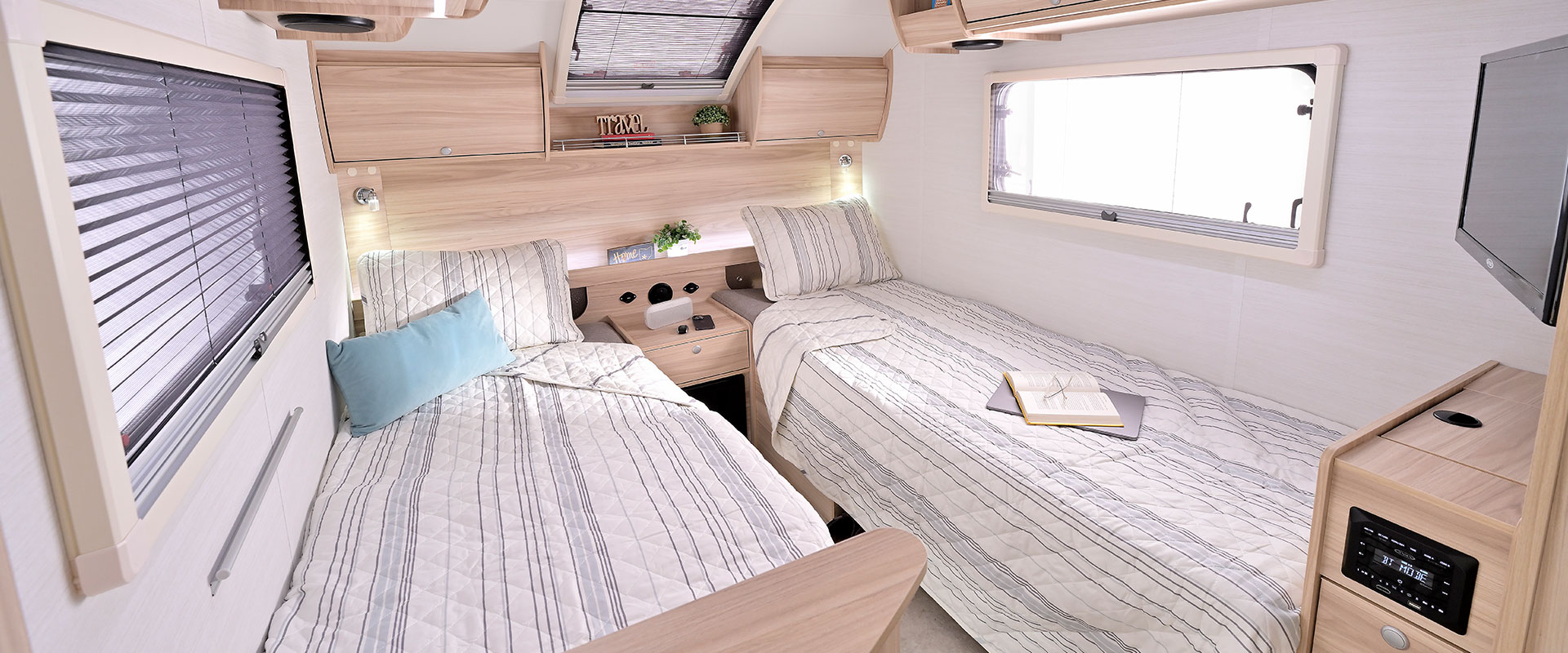This camper is larger, width, and length than the TAB 320 teardrop camper, ensuring a comfortable and spacious experience. Designed for the adventurous road warrior entrepreneur, its thoughtful split-bed layout includes a designated workspace and a generous sleeping area, perfectly combining productivity and relaxation.