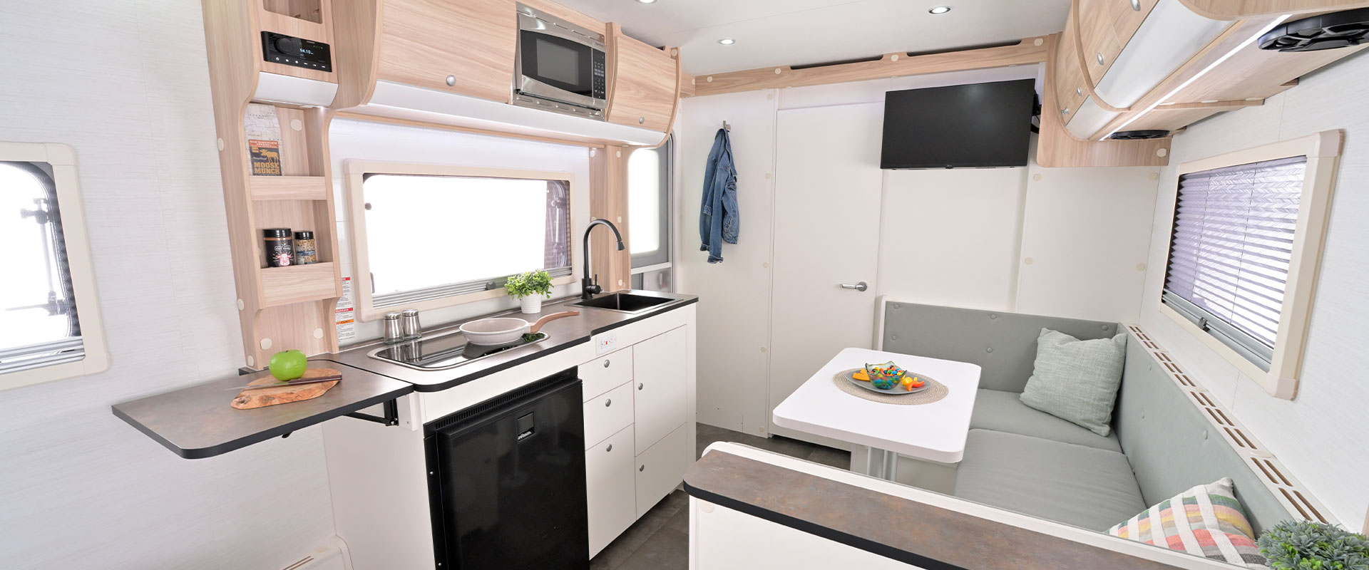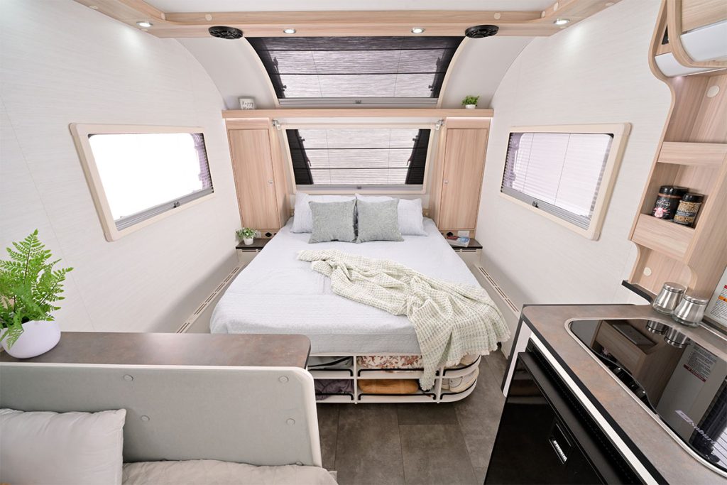 Handcrafted in the picturesque region of Ohio’s Amish country, the Haven maximizes both comfort and functionality, showcasing the impeccable craftsmanship that nuCamp is celebrated for. Features include a serene walk-around queen bed (with a twin bed option set to be available later this year), a spacious dry bath ensuring residential-style convenience, and a large four-person dinette perfect for sharing meals, working, or enjoying leisure time together.