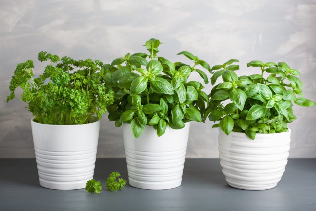 Herbs can be grown in small pots or hanging shoe bags with holes added for drainage. When watering them, suspend them in your shower or put potted plants below to catch the drips. Larger plants would do well in five-gallon buckets with drainage holes in the bottom (don’t forget to put a dish or tray underneath), plastic totes, or a stackable planter or garden tower.