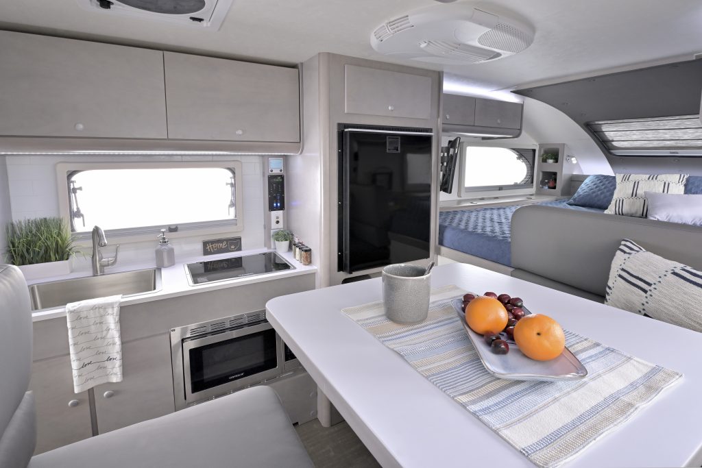 The Cirrus 820 has a spacious interior packed with all the comforts you need to make the Cirrus your home away from home. The wet bath features a toilet, sink, and shower. The well-equipped kitchen includes a 2-burner stove, microwave, sink, and a large refrigerator. The spacious bed faces North to South, allowing two people to sleep comfortably without disrupting the other when getting in or out of bed. The stargazer window also provides a beautiful view of the sky.