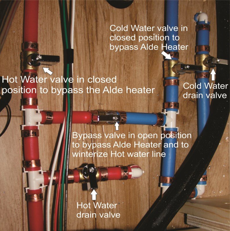 - Close all the faucets and position the valves to “Winterization Mode” as shown (see figure 1.2) to bypass the Alde Heat & Water System. We highly recommend that you bypass the Alde Heating system – choosing to not do so will result in having to thoroughly flush the Alde System when you take your trailer out of storage to prevent damage to the hot water system of the Alde.