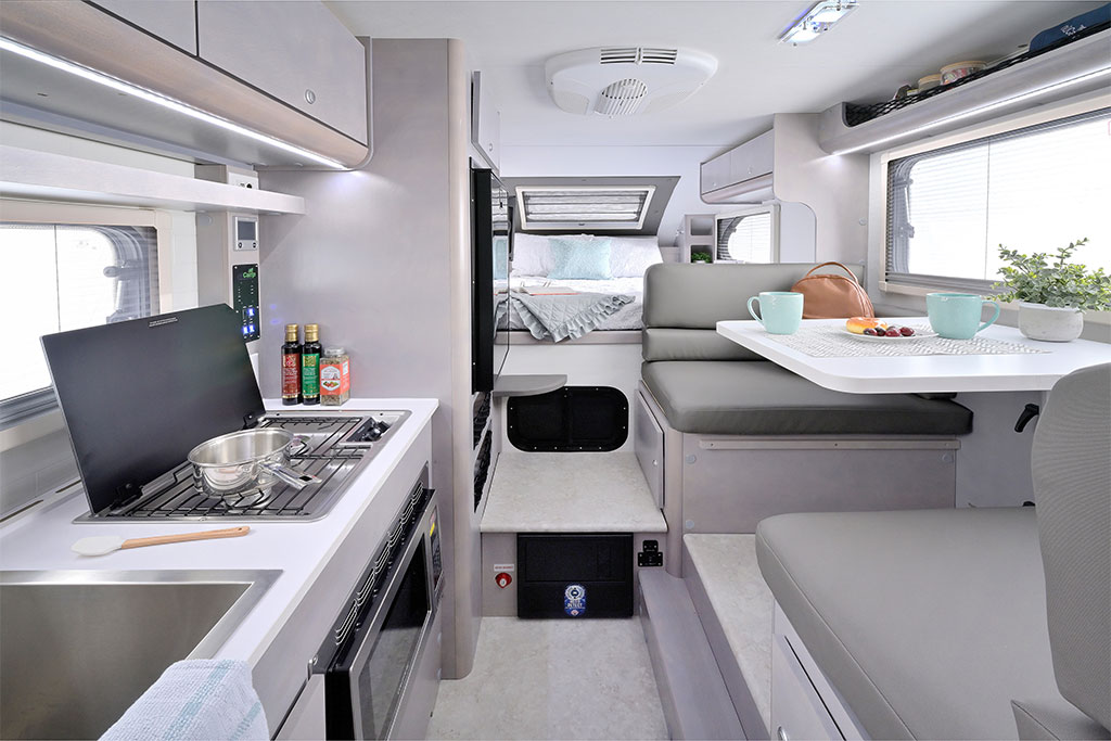 Consider the Cirrus 820 your home away from home. Its well-equipped kitchenette allows you to prepare delicious meals right at your campsite. You’ll find top-quality appliances, including a 2-burner stove, sink, fridge, and convection microwave, ensuring convenience and culinary delight.