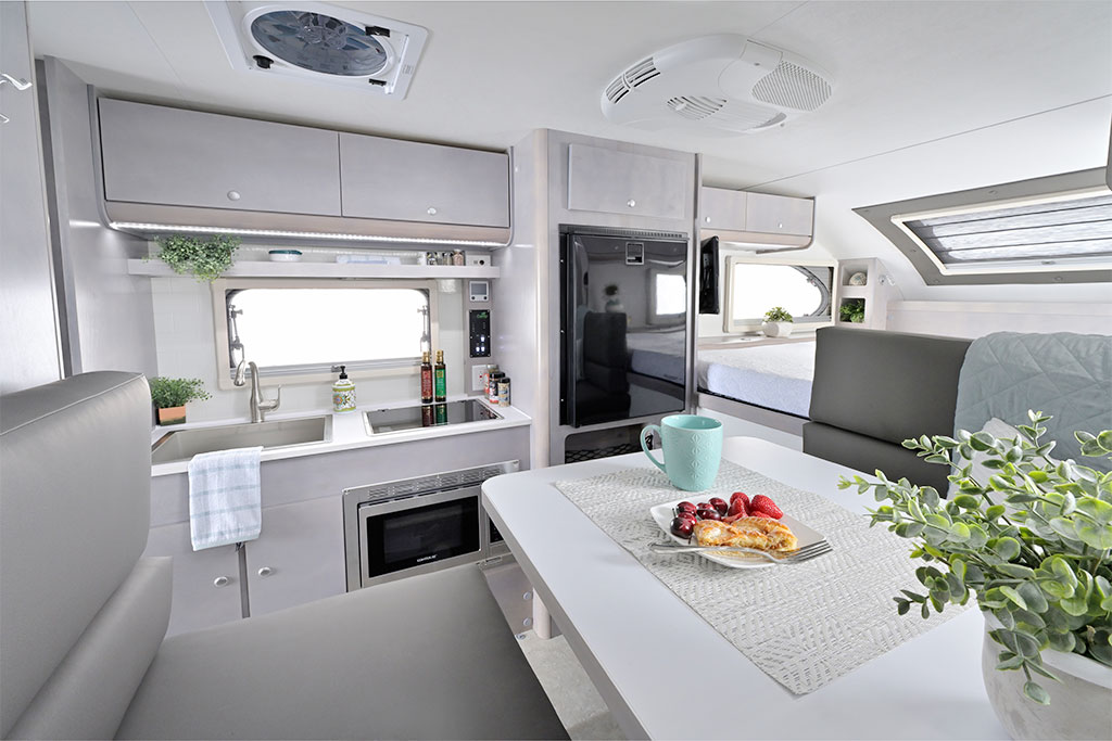 Need extra sleeping space? The dinette easily converts into a second sleeping area. The designated sleeping area features the Froli™ Sleep System for ultimate comfort, ensuring a restful night’s sleep. The spacious bed sits beneath a large stargazer window, offering a breathtaking view of the night sky as you drift off after a day of exploration.