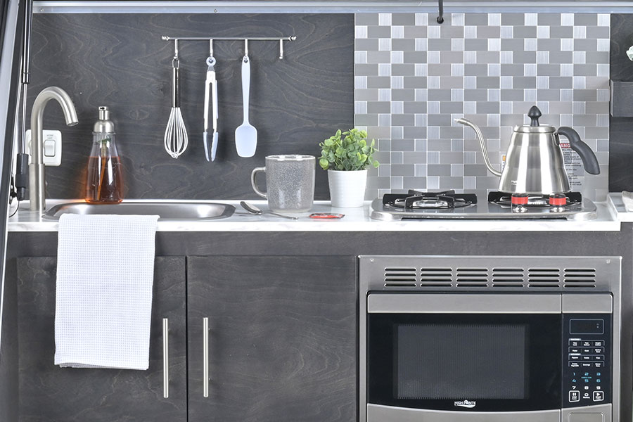 The TAG Travel Trailer lets you bring some of the comforts of home when you hit the road camping. Custom Ohio-Amish cabinetry provides multiple storage options as you travel, including additional storage below the bed. Enjoy being surrounded by nature as you use the well-equipped rear kitchen galley featuring a sink and two-burner stove. At night, you’ll climb into a warm and cozy interior – complete with a large window for stargazing. The spacious bed, along with the heating and cooling systems, will keep you dry and comfortable. We also offer the TAG XL Teardrop Travel Trailer, which adds an extra foot to the width, giving you a bit more counter space and a little more sleeping room. Compare our TAG Teardrop Travel Trailers here.