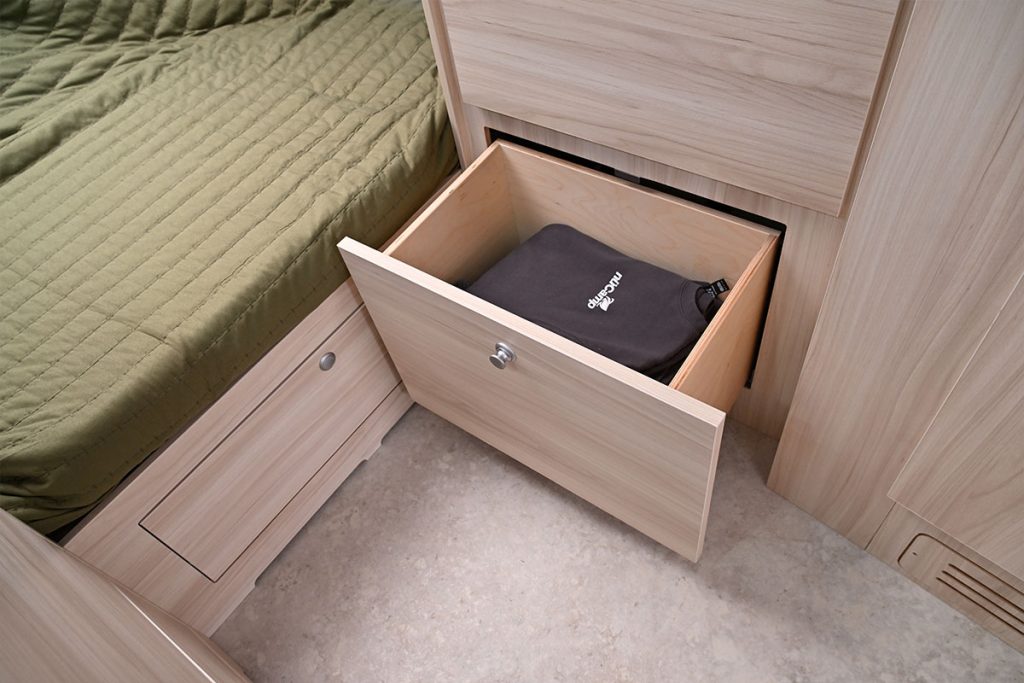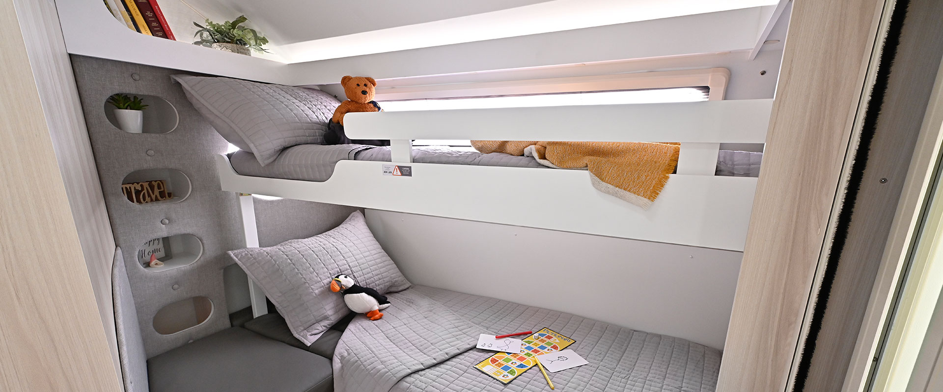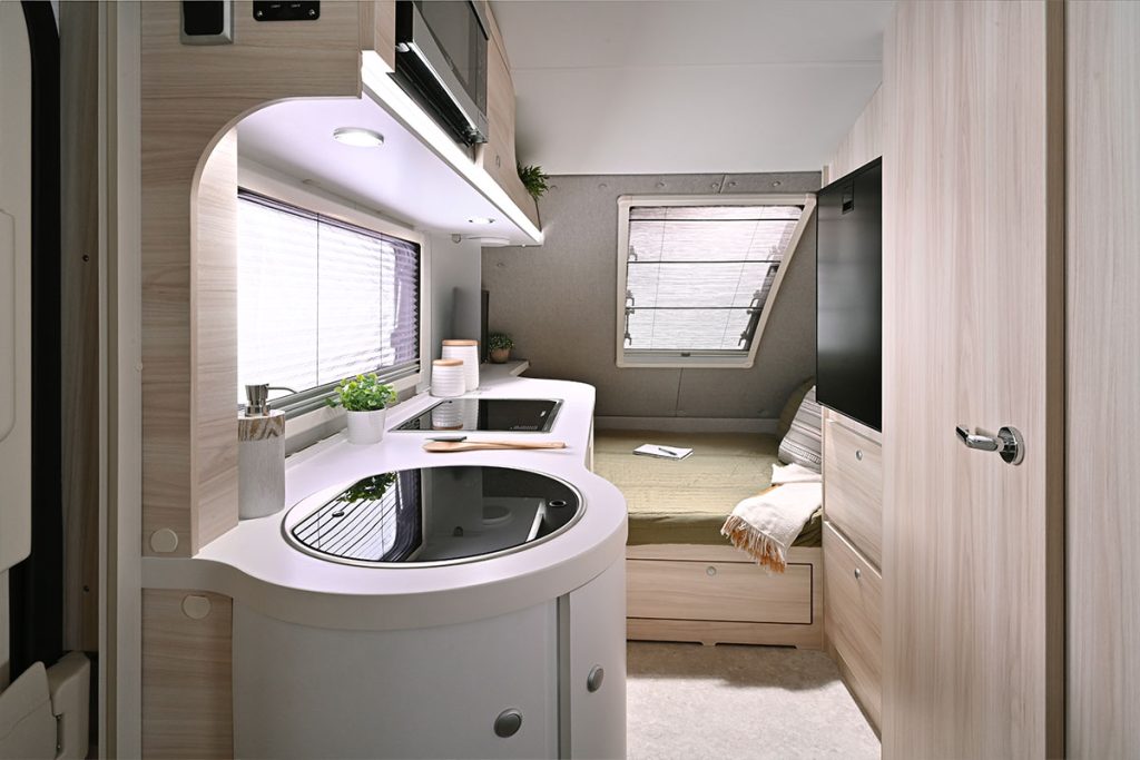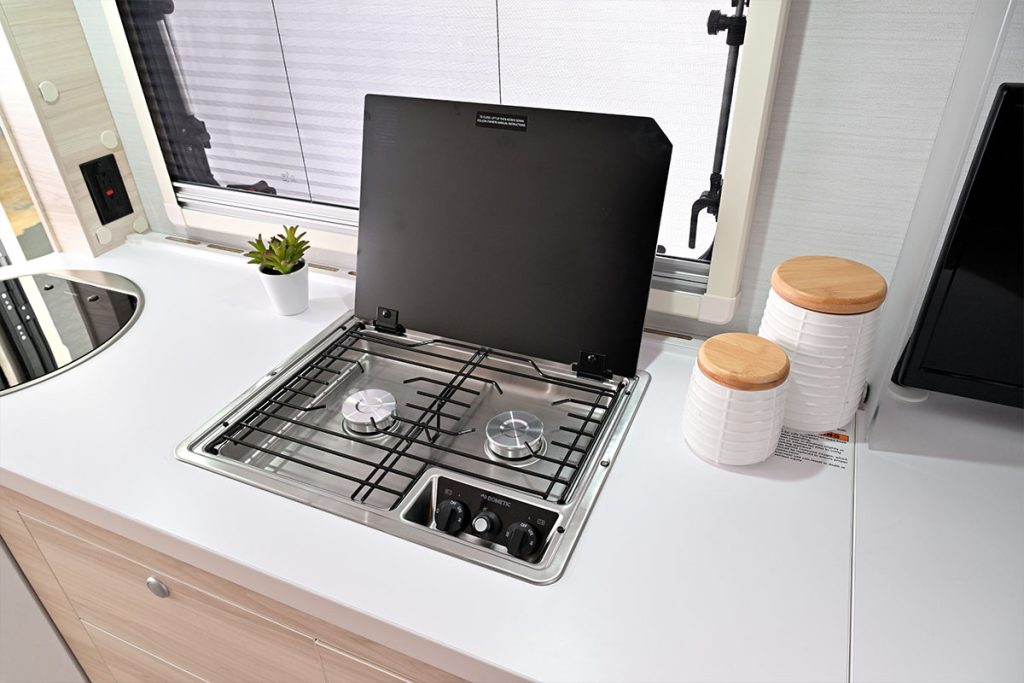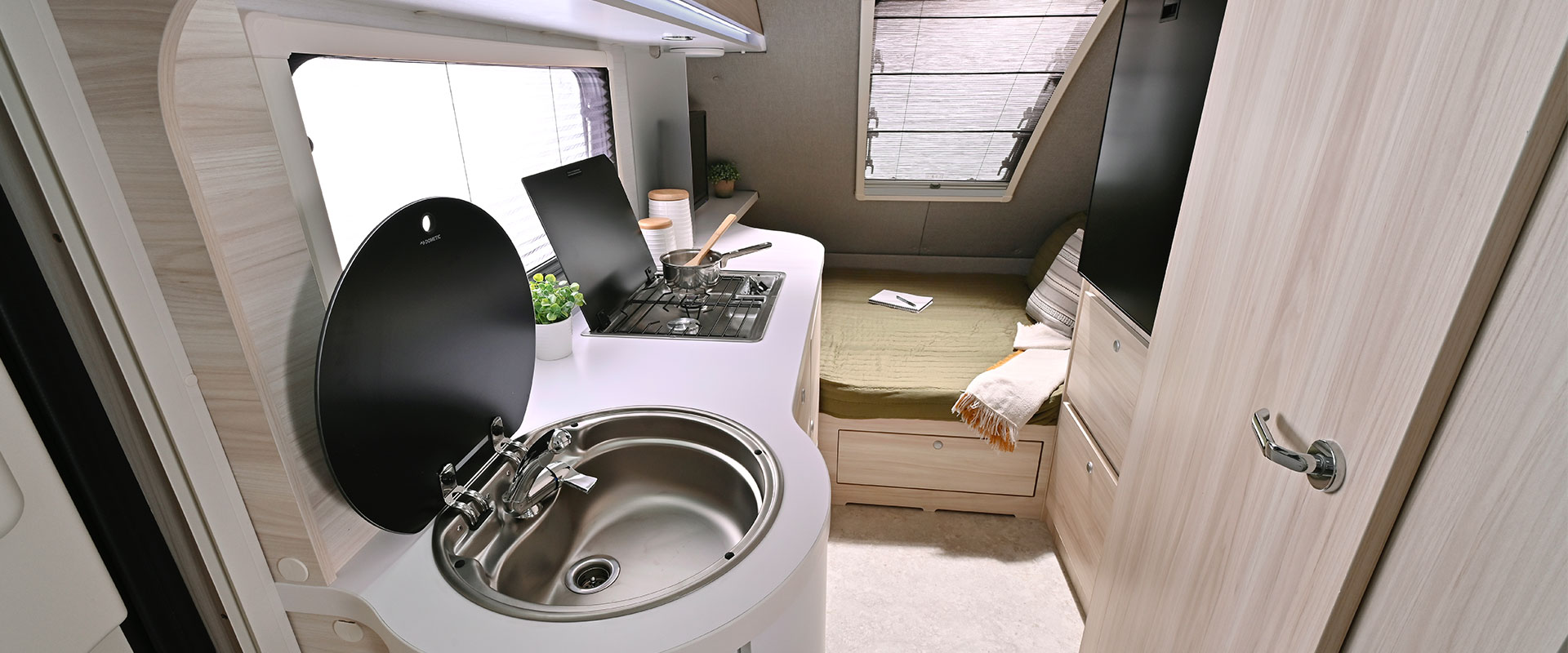 Camping in the TAB 400 feels more like glamping, thanks to the Alde® heating system, which keeps you warm and cozy on cool nights while providing hot showers. The galley kitchen allows you to prepare meals without having to leave the campground, featuring a sink, a 2-burner glass-top stove, and a roomy fridge.