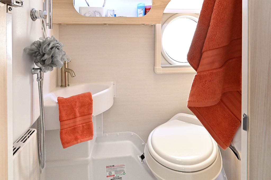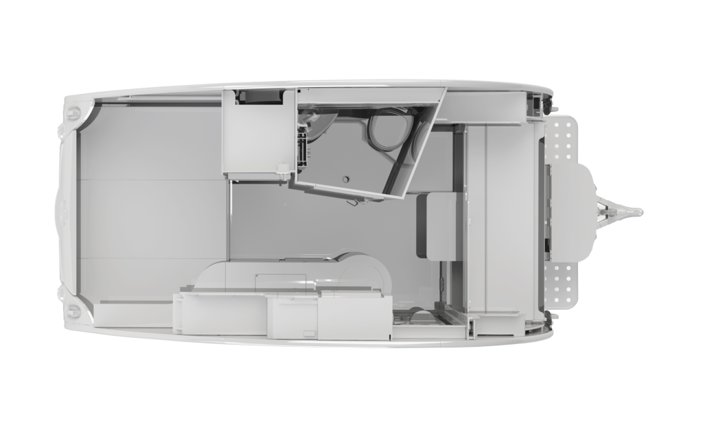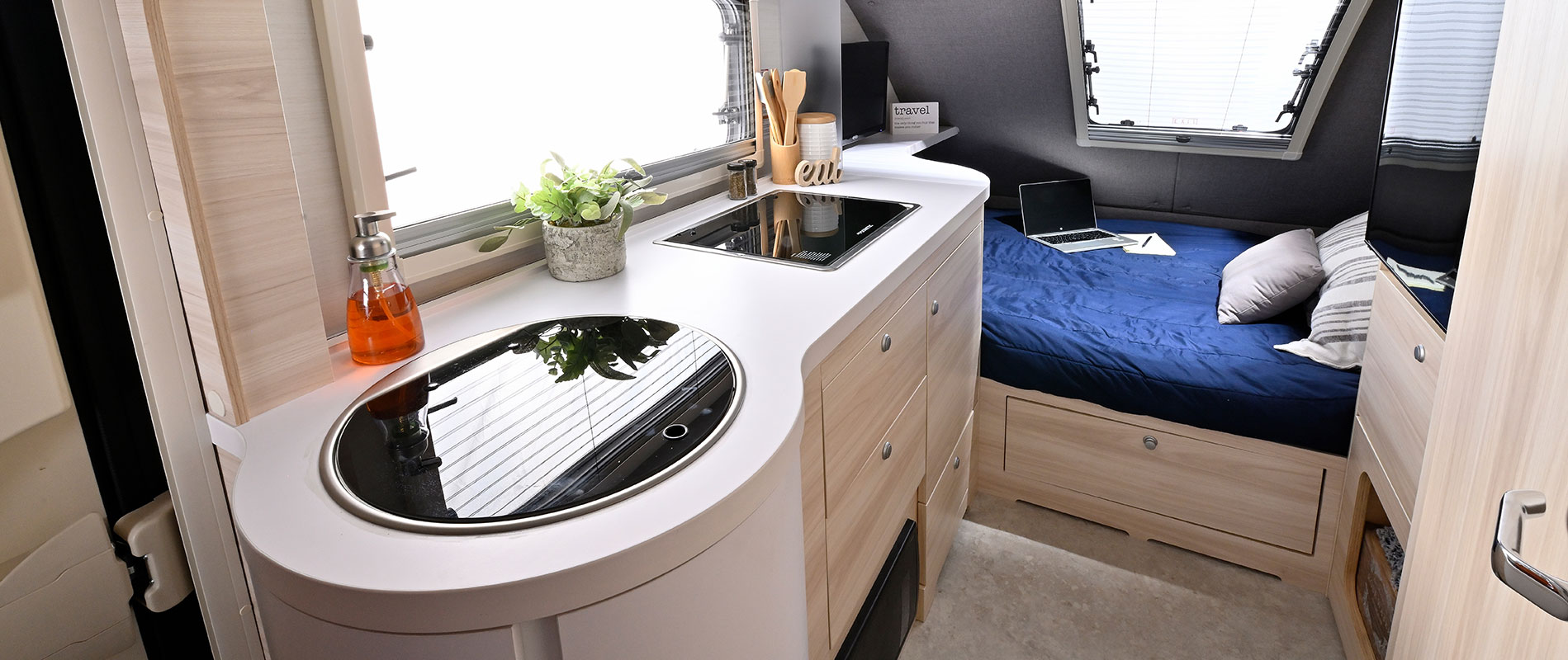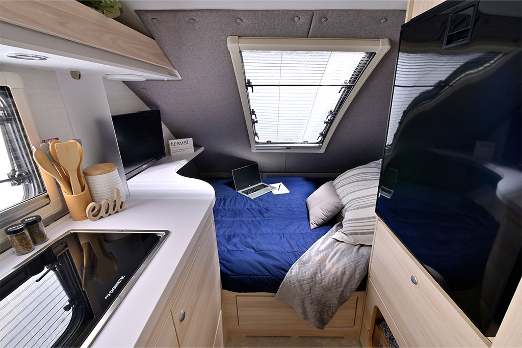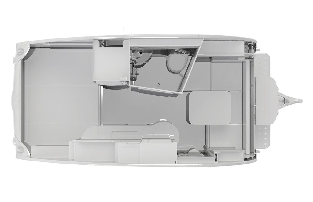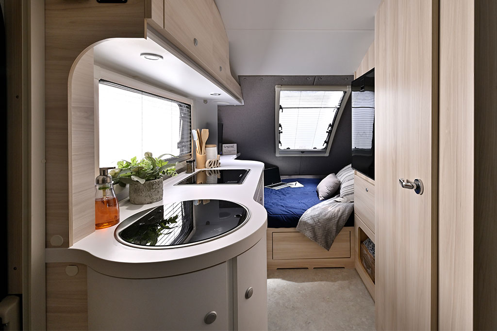 Inside, you’ll find a dedicated queen-size sleeping area, a spacious wet bath, a galley kitchen, plenty of storage, and a dinette that converts into a second sleeping area. Camping in the TAB 400 Teardrop Camper will be more like glamping with the Alde® heating system, keeping you warm and cozy on cool nights and providing hot showers. With the galley kitchen, there is no need to leave the campground. The kitchen includes a sink, a 2-burner glass-top stove, and a roomy fridge.