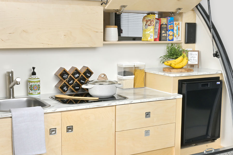 If your perfect outdoor adventure involves cooking while surrounded by nature’s beauty, then the TAB CS-S is the teardrop camper for you. The clamshell embodies the traditional teardrop trailer design and includes a well-equipped kitchen in the rear hatch. You’ll find everything you need to prepare a delicious meal in the outside kitchen, including a microwave, 2-burner glass-top stove, and 12v refrigerator. The custom Ohio Amish-made cabinetry features open cabinets to allow you to easily pass-through items from the rear kitchen to the interior cabin.