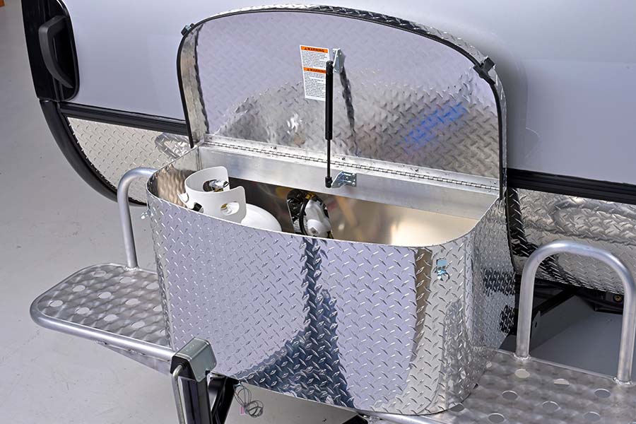 Wanting even more adventure while camping? The boondock package features everything you need to take the road less traveled. Aggressive off-road tires, a pitched axle, and more ground clearance make this teardrop camper built for more rugged