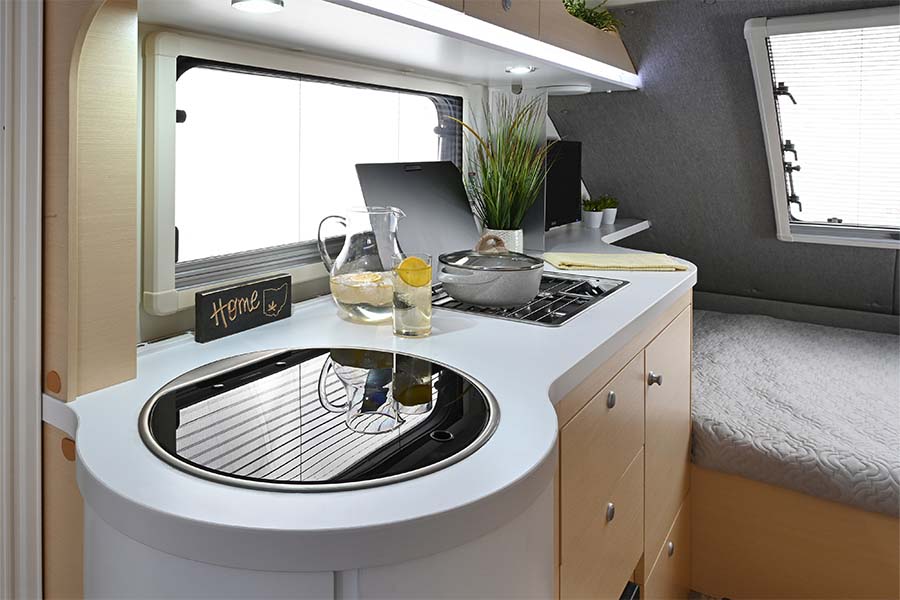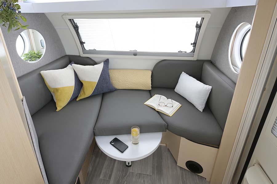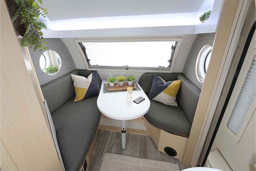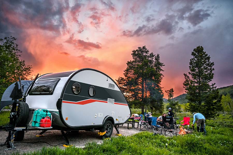 If you love the unique shape of teardrop trailers but need a little more space, look no further than the TAB 400. This camper is our largest and most spacious teardrop. It’s the perfect size for those looking to be out on extended camping trips and adventures. Inside, you’ll find a dedicated queen-size sleeping area, a spacious wet bath, a galley kitchen, plenty of storage, and a dinette that converts into a second sleeping area. The TAB 400 is designed to be your home away from home.