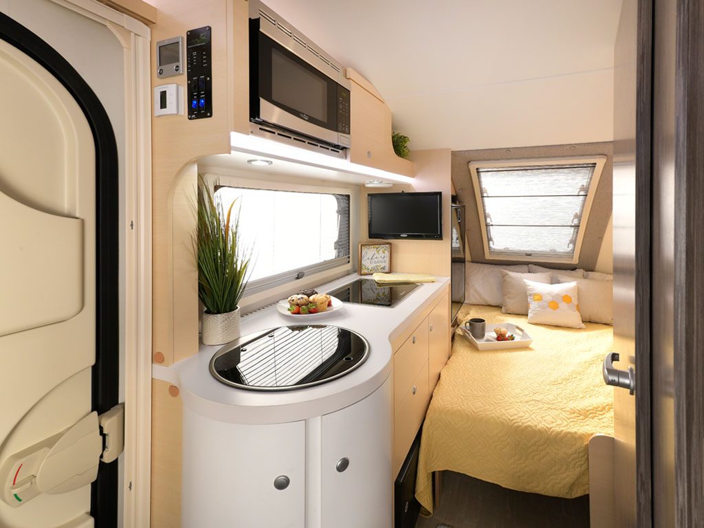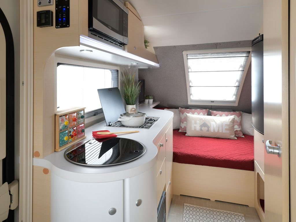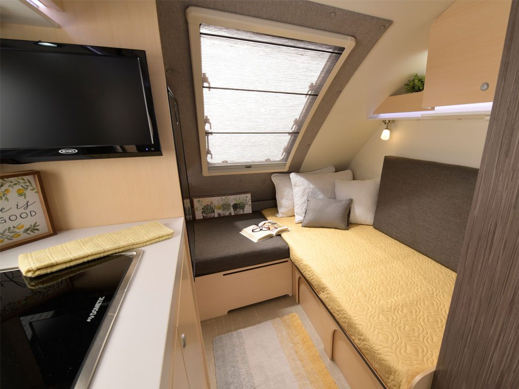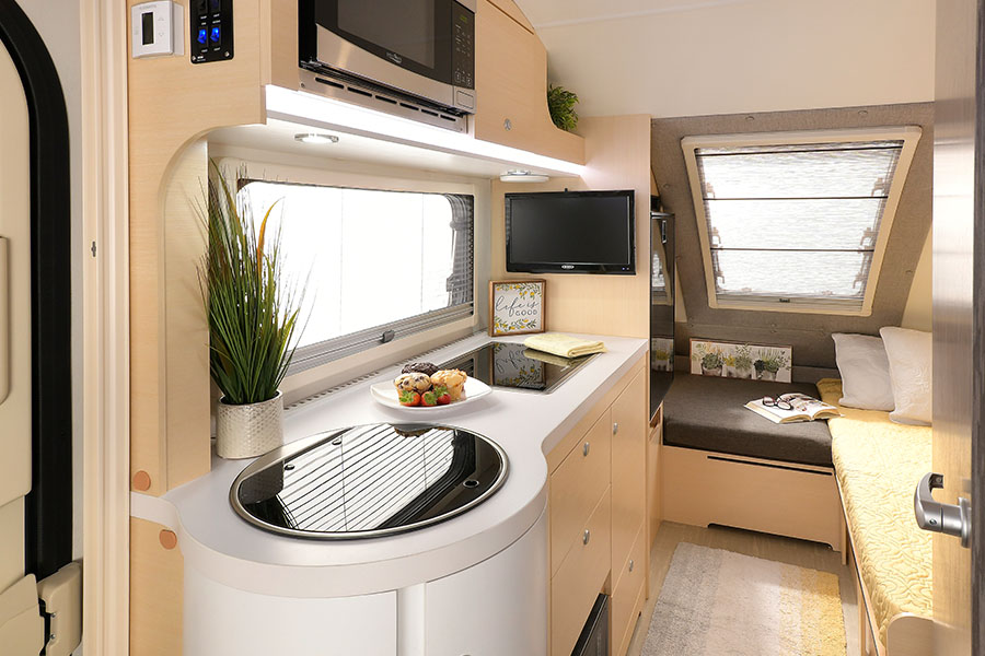 Do you love the teardrop design, but need more room? The TAB 400 is our largest and most spacious teardrop camper. It’s perfect for adventurers who like to get out and stay out for longer periods of time. Inside the camper, you get a dedicated queen size sleeping area, spacious wet bath, roomy kitchen, plenty of storage, and a dinette that can convert into a second sleeping area. With all of that, the TAB 400 is your home away from home.