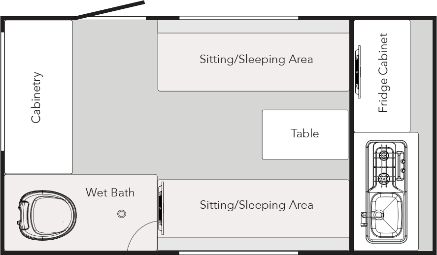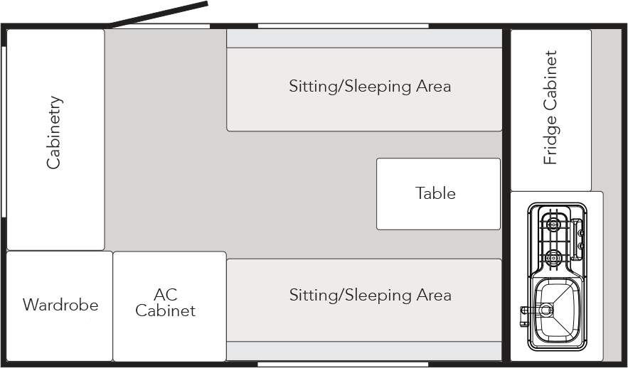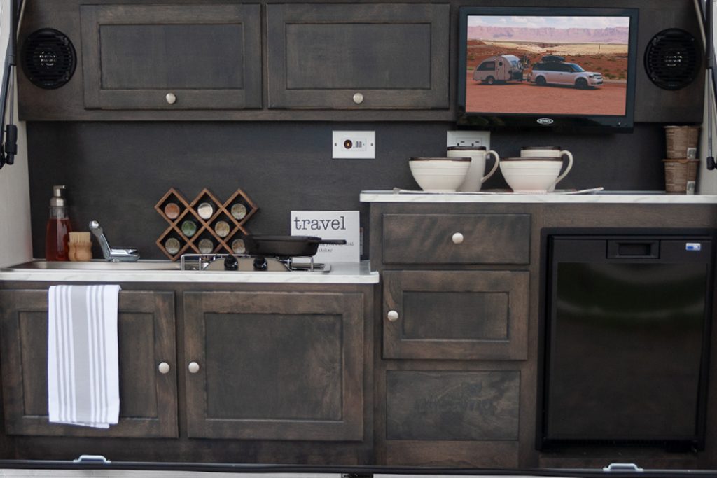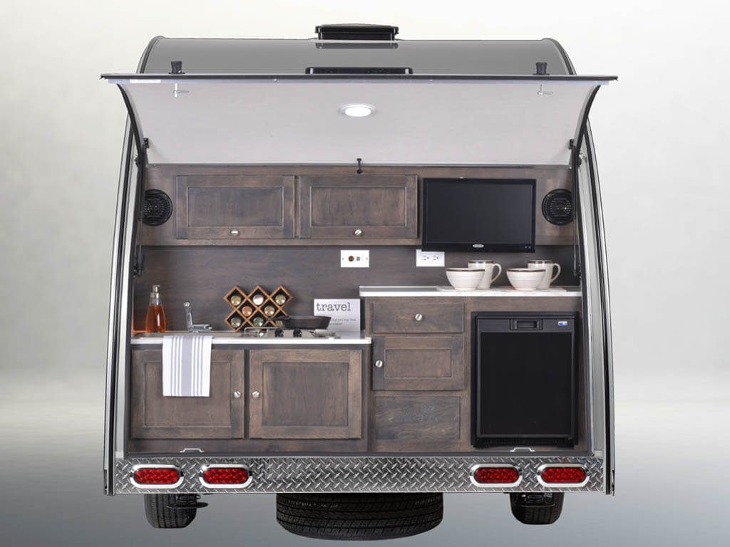 Do you love the outdoors a little more than the average camper? If so, the TAB Clamshell is for you! The Clamshell model originates from the traditional teardrop design where the kitchen is contained in the back hatch. The front of the trailer features cabinetry and a wardrobe in lieu of the standard kitchen space.