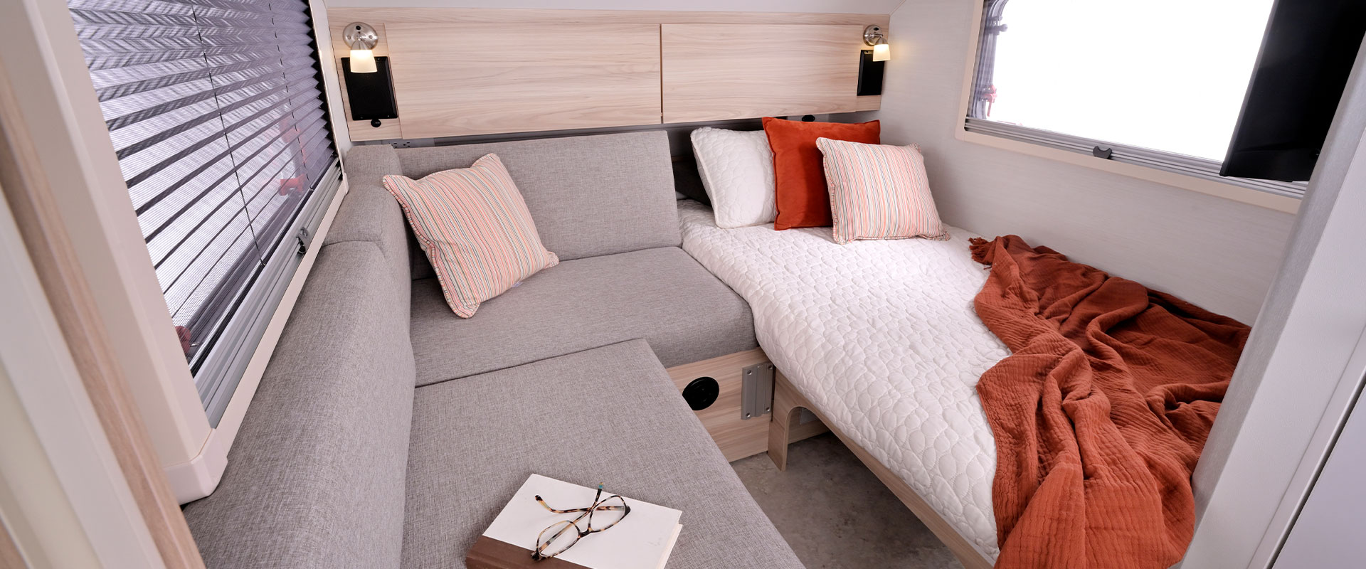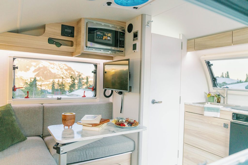 The TAB Teardrop Camper is exceptionally lightweight, making it easy to tow and maneuver. It is ideal for those who prioritize mobility and convenience without compromising comfort. Inside the camper, you will find a spacious dinette that converts into a cozy sleeping area. The split cushions offer multiple configuration options, allowing you to customize your sleeping arrangements, whether traveling alone or with a partner.