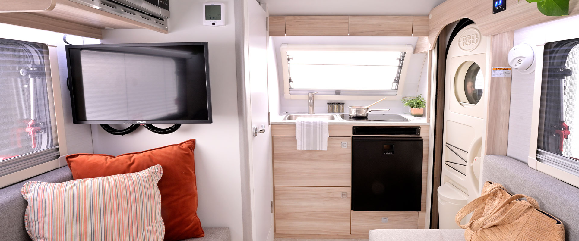 Inside, the TAB 320 offers a comfortable living space equipped with a full-featured kitchenette, a cozy sleeping area, ample storage, and even a bathroom, everything you need for a convenient and enjoyable camping experience.