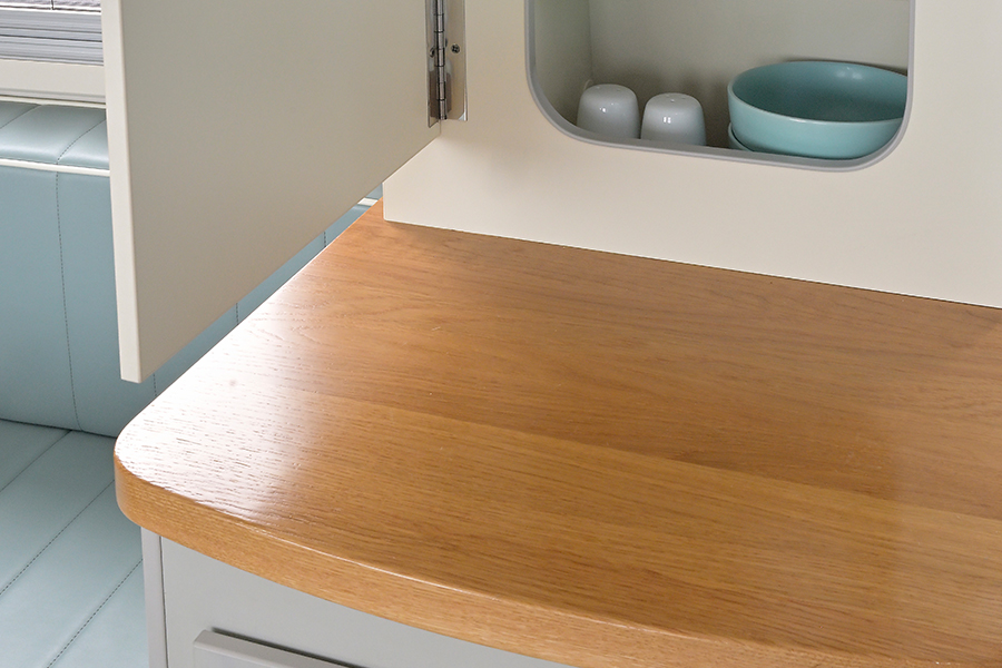 The Barefoot Travel Trailer offers everything you would want when glamping – a spacious U-shaped dinette that converts into a comfortable sleeping area. The galley kitchen features a refrigerator, a deep basin sink with a folding faucet, and a glass top, offering more counter space when not in use. The wet bath comes with a cassette toilet and a retractable showerhead for indoor/outdoor use. Get hot water and stay cozy with the Alde® central heat and hot water system.