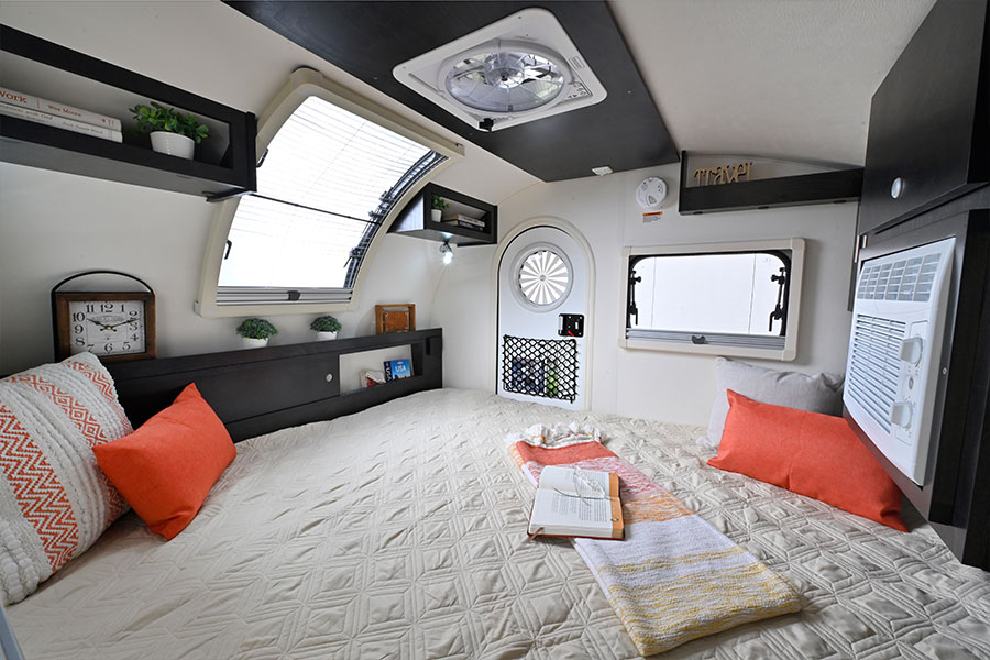 The TAG Travel Trailer lets you bring some of the comforts of home when you hit the road camping. Custom Ohio-Amish cabinetry provides multiple storage options as you travel, including additional storage below the bed. Enjoy being surrounded by nature as you use the well-equipped rear kitchen galley featuring a sink and two-burner stove. At night, you’ll climb into a warm and cozy interior – complete with a large window for stargazing. The spacious bed, along with the heating and cooling systems, will keep you dry and comfortable. We also offer the TAG XL Teardrop Travel Trailer, which adds an extra foot to the width, giving you a bit more counter space and a little more sleeping room. Compare our TAG Teardrop Travel Trailers here.
