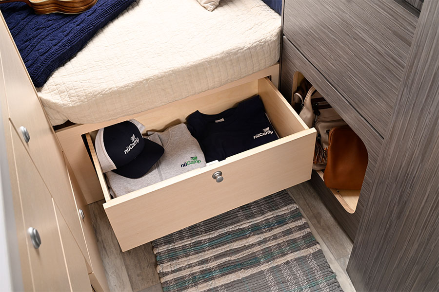 If you love the unique shape of teardrop trailers but need a little more space, look no further than the TAB 400. Inside, you’ll find a comfortable dinette with a hidden bunk – there when you need it and hidden in plain sight when you don’t. The new bunk makes this the perfect teardrop trailer for small families or grandparents who enjoy taking their grandchildren on the occasional camping trip. You’ll also find a dedicated queen-size bed, a spacious wet bath, a galley kitchen, and plenty of storage. The TAB 400 has everything you need to be your home on wheels.