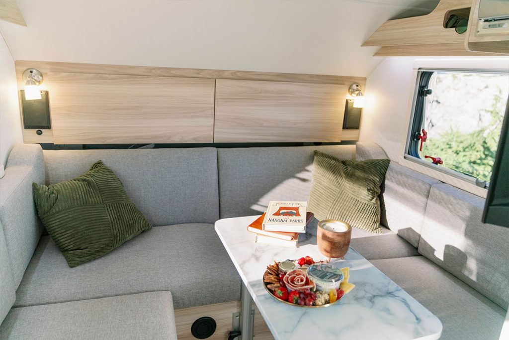 The TAB Teardrop Camper is exceptionally lightweight, making it easy to tow and maneuver. It is ideal for those who prioritize mobility and convenience without compromising comfort. Inside the camper, you will find a spacious dinette that converts into a cozy sleeping area. The split cushions offer multiple configuration options, allowing you to customize your sleeping arrangements, whether traveling alone or with a partner.